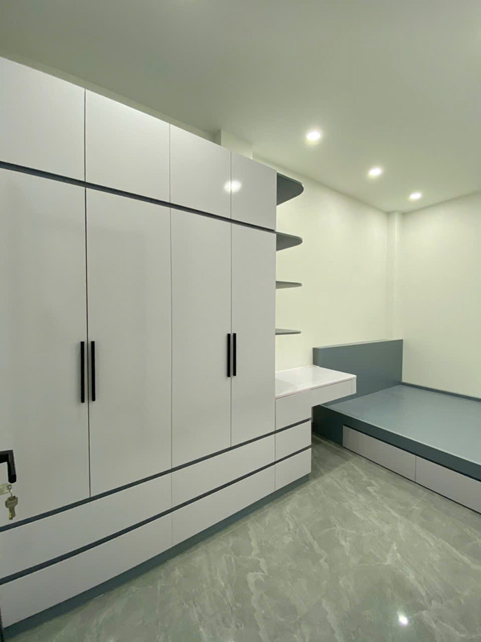 - Hệ tủ quần áo âm tường thiết kế cao sát trần, tối ưu diện tích.