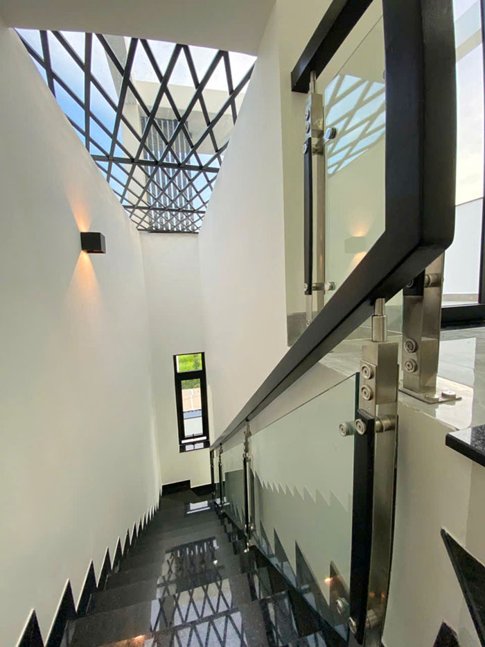 - Cầu thang: sử dụng đá granite đen sang trọng, kết hợp lan can kính cường lực tay vịn gỗ hiện đại.