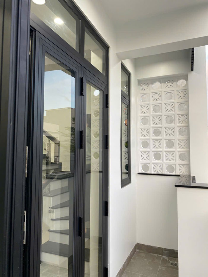 - Công trình gây ấn tượng với phong cách kiến trúc hiện đại, hình khối vuông vức, đường nét tối giản nhưng đầy tinh tế. Mặt tiền sử dụng gam màu trắng chủ đạo kết hợp cùng hệ lam sắt và lan can kim loại sơn đen, tạo nên sự tương phản mạnh mẽ, sang trọng và bền vững theo thời gian.