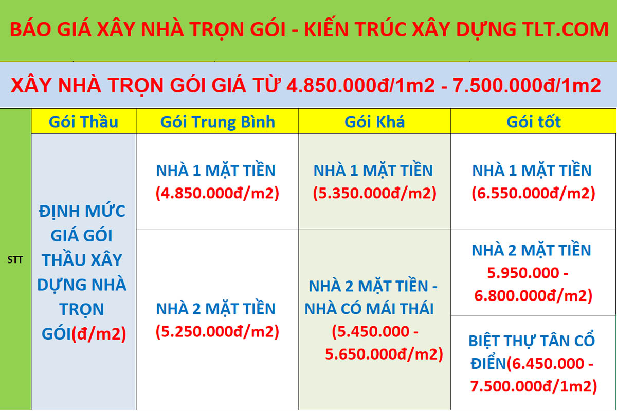 Dịch vụ xây nhà trọn gói uy tín, chất lượng hàng đầu tại Công Ty Xây Dựng TLT.COM giá chỉ từ 4.200.000đ/m2. Chúng tôi chuyên xây nhà trọn gói khu vực TPHCM, Đồng Nai, Bình Dương và các khu vực lân cận, báo giá nhanh, chính xác, khảo sát tận nơi, không bán thầu, không phát sinh chi phí, sử dụng vật tư chất lượng, đội ngũ kiến trúc- kỹ sư và đội ngũ thợ giàu kinh nghiệm, chuyên môn cao. Liên hệ: 0976272186