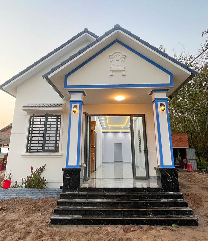 • Phối màu tinh tế: sự kết hợp giữa tông nền trắng chủ đạo cùng các đường chỉ phào màu xanh dương tạo điểm nhấn thanh lịch. Phần chân cột và bậc tam cấp được ốp đá hoa cương vân mây đen sang trọng, tăng độ bền và dễ dàng vệ sinh.