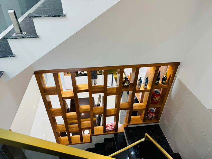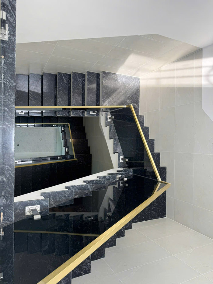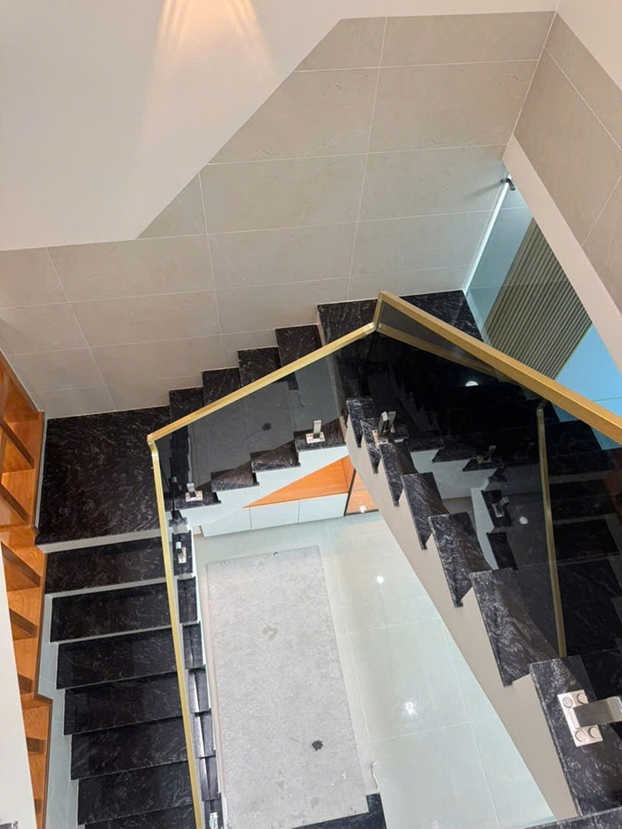 • Cầu thang dùng kính cường lực màu đen và tay vịn gỗ