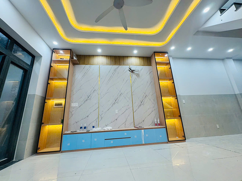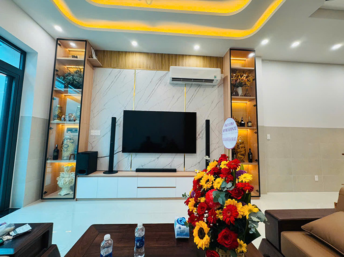 • Nội thất: bố trí tủ kệ trưng bày hai bên vách tv với hệ đèn chiếu sáng bên trong, vừa tiện dụng vừa tăng tính thẩm mỹ.