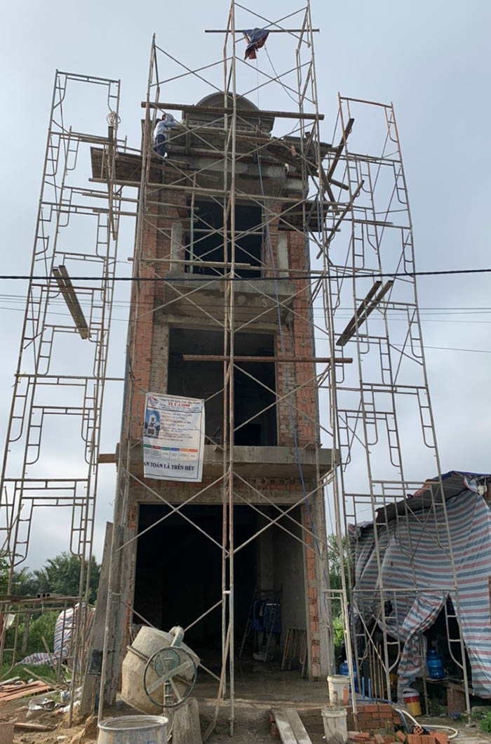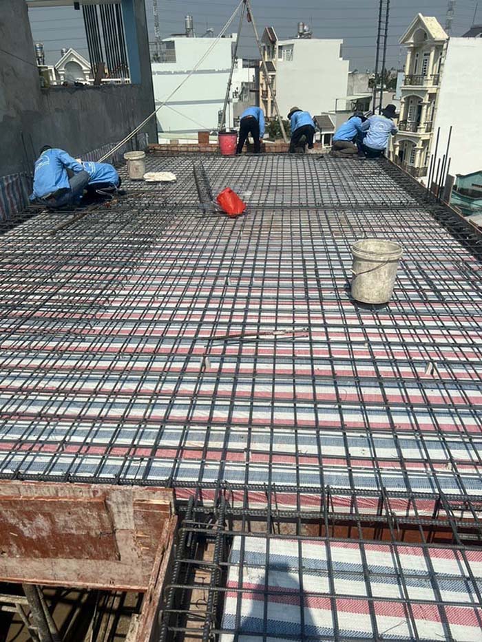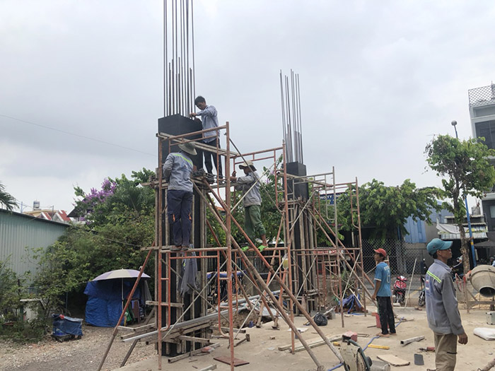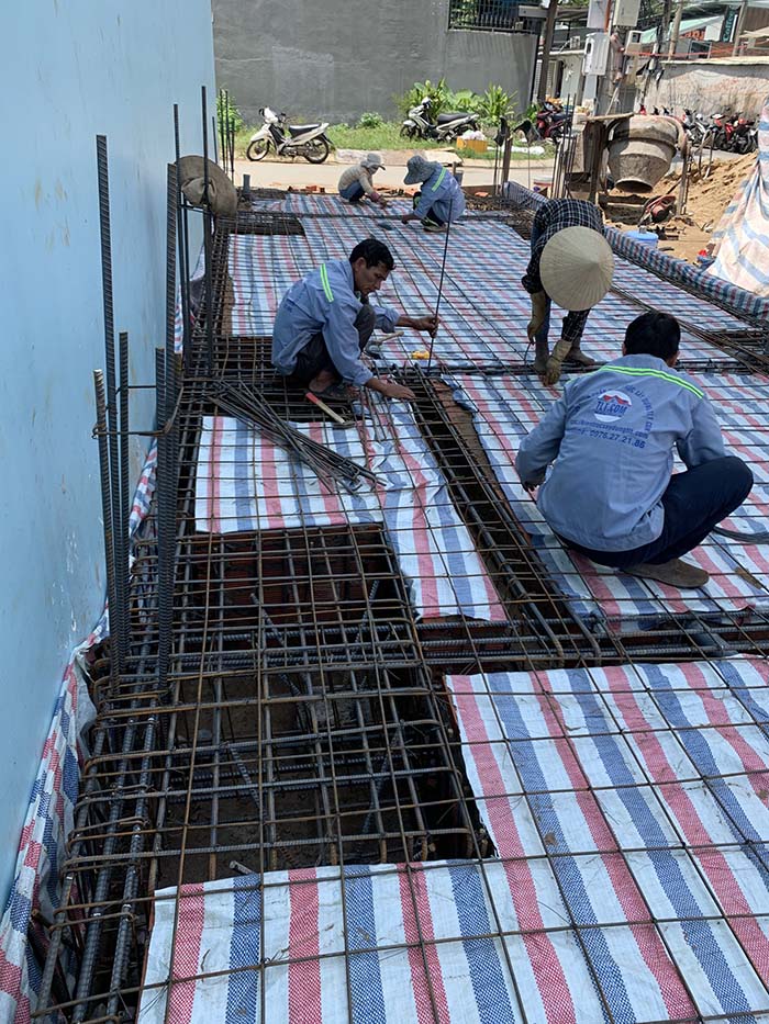 - Thi công phần khung: Lắp đặt và đổ bê tông cột, dầm, sàn các tầng, thi công cầu thang, tường bao, hệ thống cấp thoát nước và điện. Kiểm tra, nghiệm thu, bảo dưỡng theo từng giai đoạn.